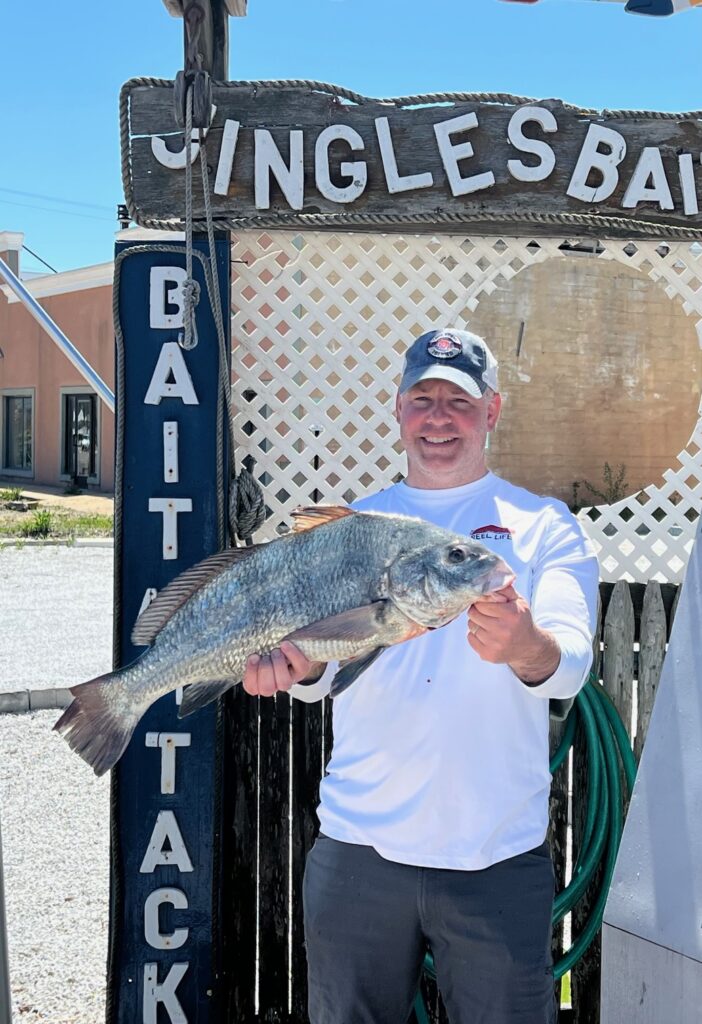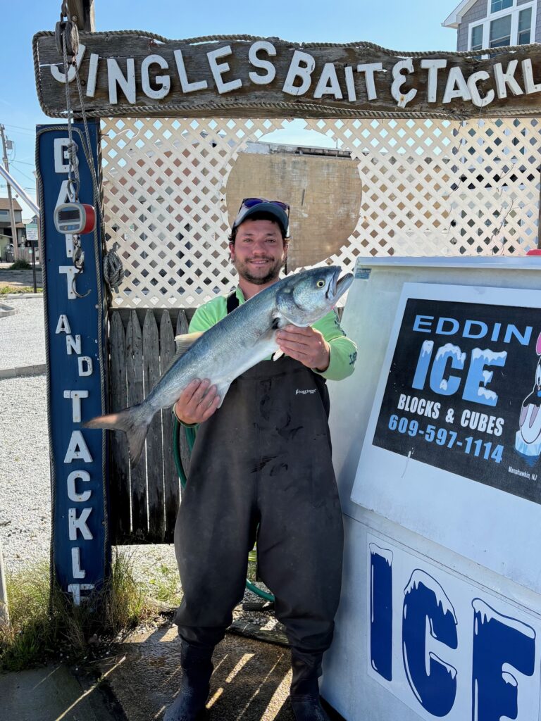 The bite is on and there was quite a bit of action yesterday on the surf. Many reports of bass, blues and dogfish…. And then Dave Crouthamel showed up with this nice black drum – caught on clams – 10.96# and 257/8″! Next Danny Federico (of LBI Surf Fishing Guide Services) weighed in a 6.8#, 28 7/8″ bluefish putting him in first place for the bluefish segment of the Jingles Store Tournament. Jonathan Kelly (of LBI Sport Fishing) has been busy catching some big striped bass off the surf but yesterday he topped that by catching this big monster 52″ striped bass while trolling. Fluke season is open and seeing some nice keepers being caught out back in the Great Bay area.