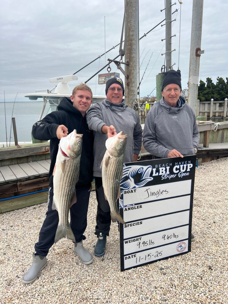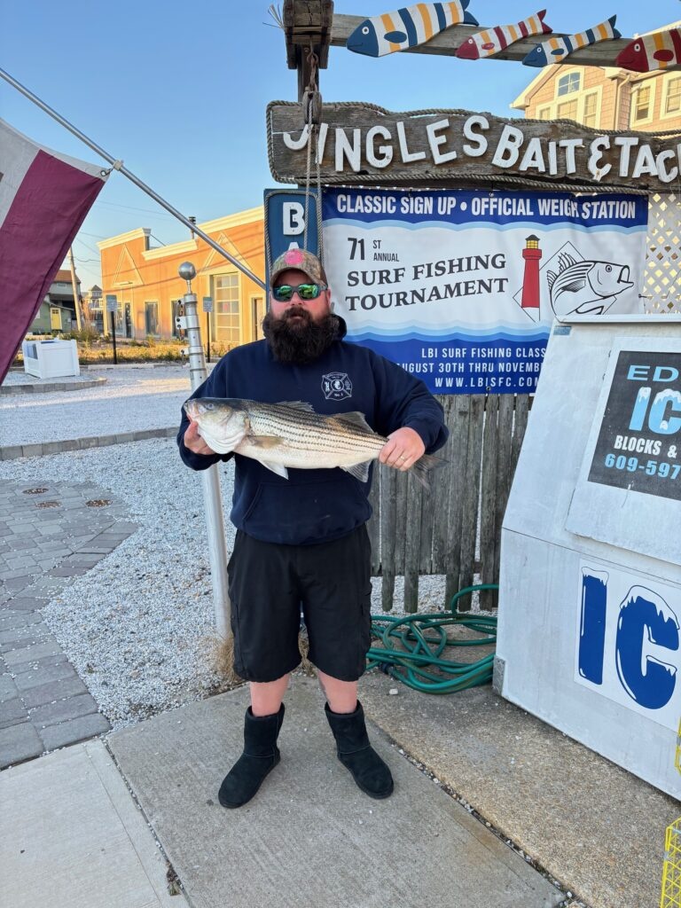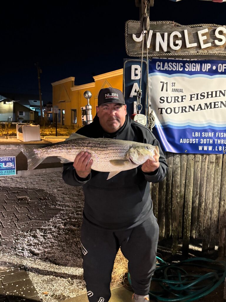 With one week to go in the 71st LBI Surf Fishing Classic, weigh-ins continue each day! Yesterday, here at Jingles, John Sullivan brought in this 9.20# and 29″ striped bass that he caught on a lure in Holgate! And Danny Federico also brought in a catch – he had a 1.3# weakfish. Connor Smilon is out fishing this morning in Beach Haven and caught a short on a bucktail. He is also reporting bunker tight to the beach this morning. Anglers continue to get tog up at the lighthouse that are also still being weighed in for the tournament. So if you are here this week for the Thanksgiving Holiday, then be sure to get out on the beach and do some surf fishing or get up on the rocks and catch some tog!