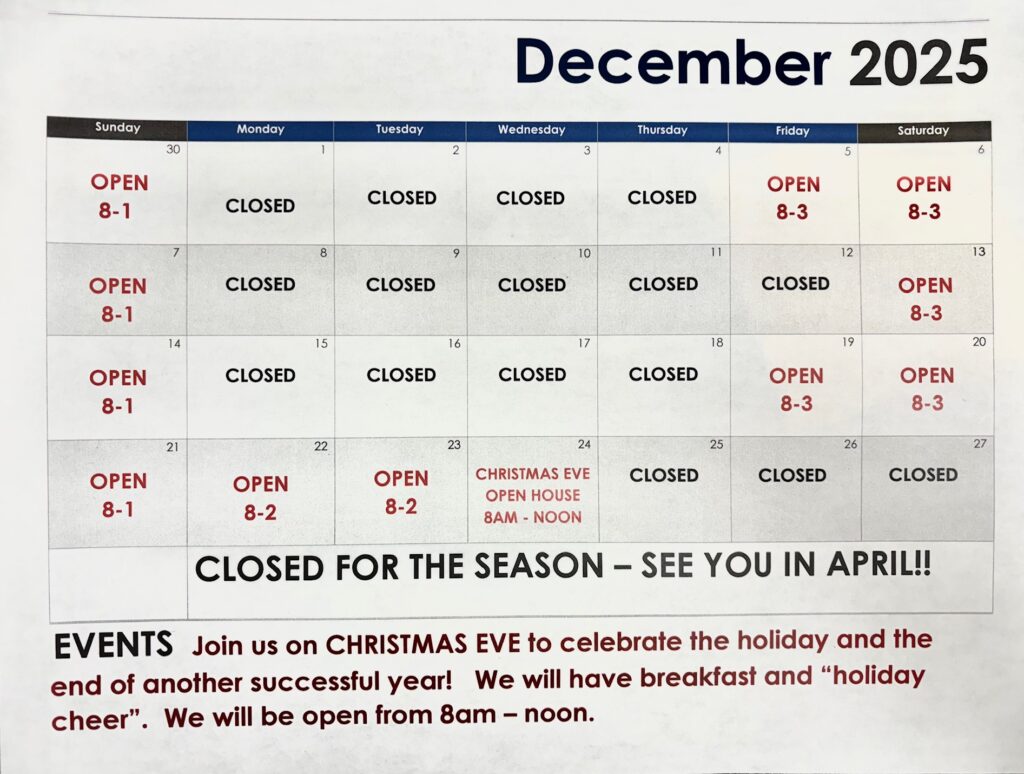 We are in the home stretch of the season, so after tomorrow, we will only be open on weekends until Christmas. See our December Calendar.
