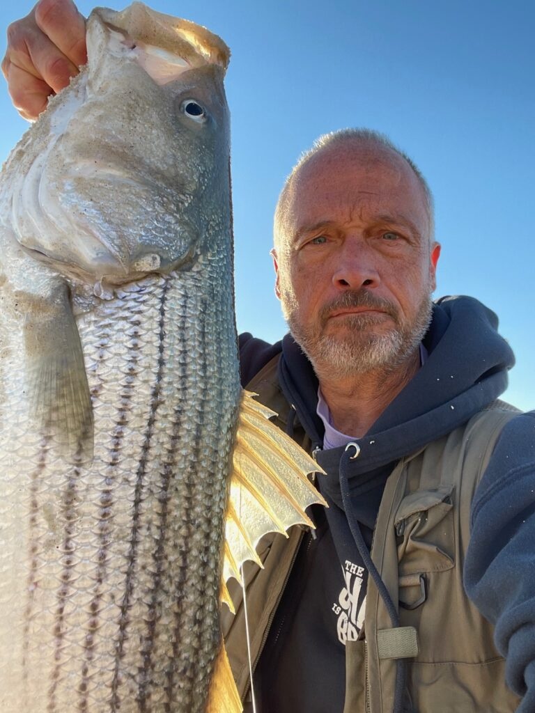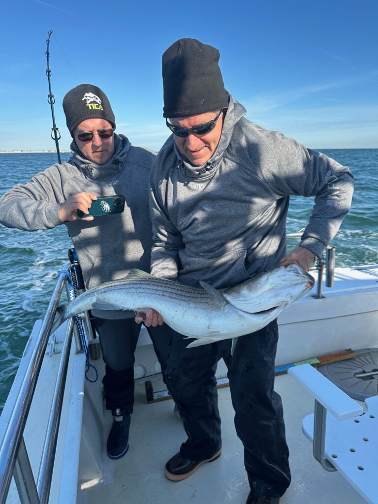Stripers are here and there…. mostly too big, with a periodic slot weigh-in every. And yesterday is was Emmett Fitzgerald’s day! Emmett weighed in this fatty last evening caught in Harvey Cedars – 13.08# and 30″! He was using an artificial soft bait. We had some other striper reports earlier in the week – Pat Gallen caught this 34″ beauty (wearing his lucky Jingles Hoodie!) and another customer had a 44″ – both safely released to swim another day. By boat, we are seeing some big cows also, but they are still catching those still north of the island. Anglers are still catching Tog up at the lighthouse where is is still 1 per person until Sunday when it becomes 5 per person!