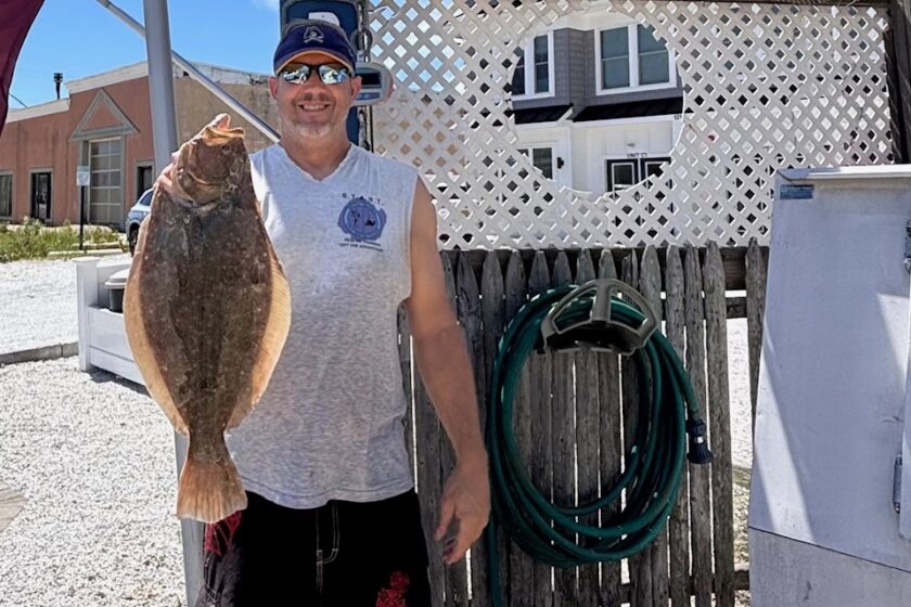 Mike Lapotasky with a 3.4# and 21″ fluke off the surf using a Jingles Fluke Rig!
