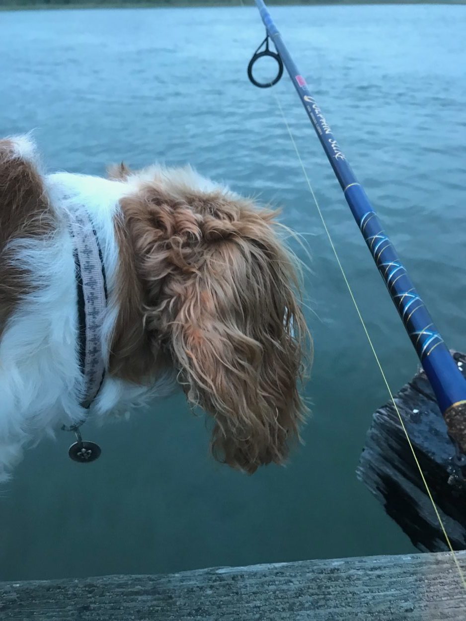So we went fishing last evening over at Morrison’s after we closed. We caught a bunch of oyster crackers, as well as 3-4 sea bass. A few people were out fishing for weakfish but no luck while we were there. And as usual, Nola needs to know what is happening and be part of the action.